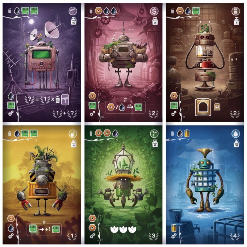 À votre tour, piochez deux droïdes, donnez-en un à votre adversaire et choisissez comment utiliser le vôtre : recyclage, réparation ou construction d’habitation. Ces actions sont résolues simultanément, garantissant un rythme soutenu et sans temps mort. Le jeu propose six types de droïdes, quatorze habitations aux conditions de scoring variées (quatre utilisées par partie), et un matériel riche : plateaux personnels, nombreuses ressources, et une boîte de jeu astucieusement intégrée au déroulement des manches.